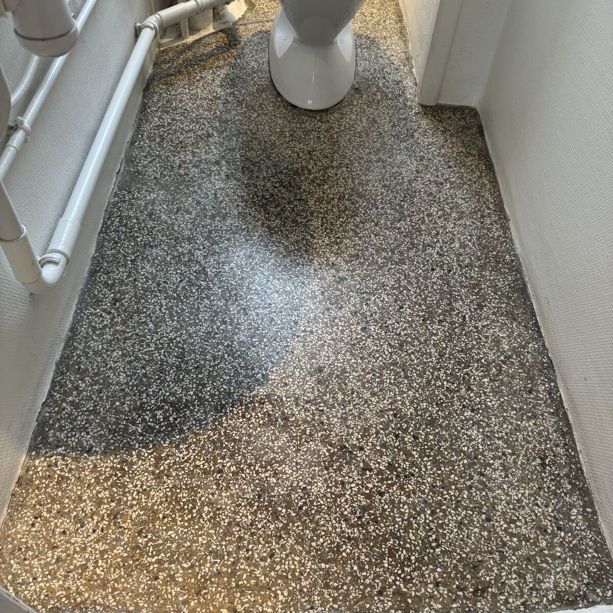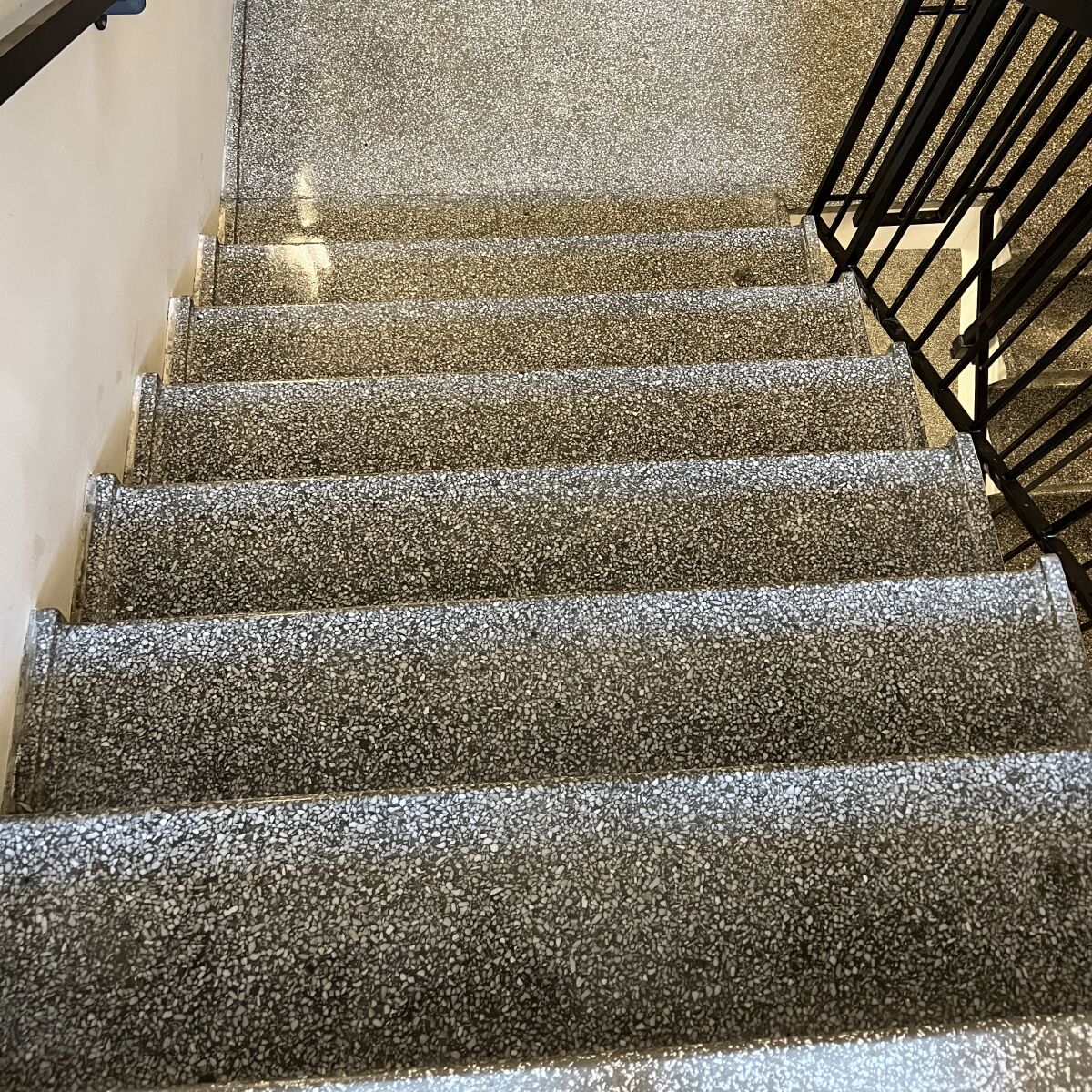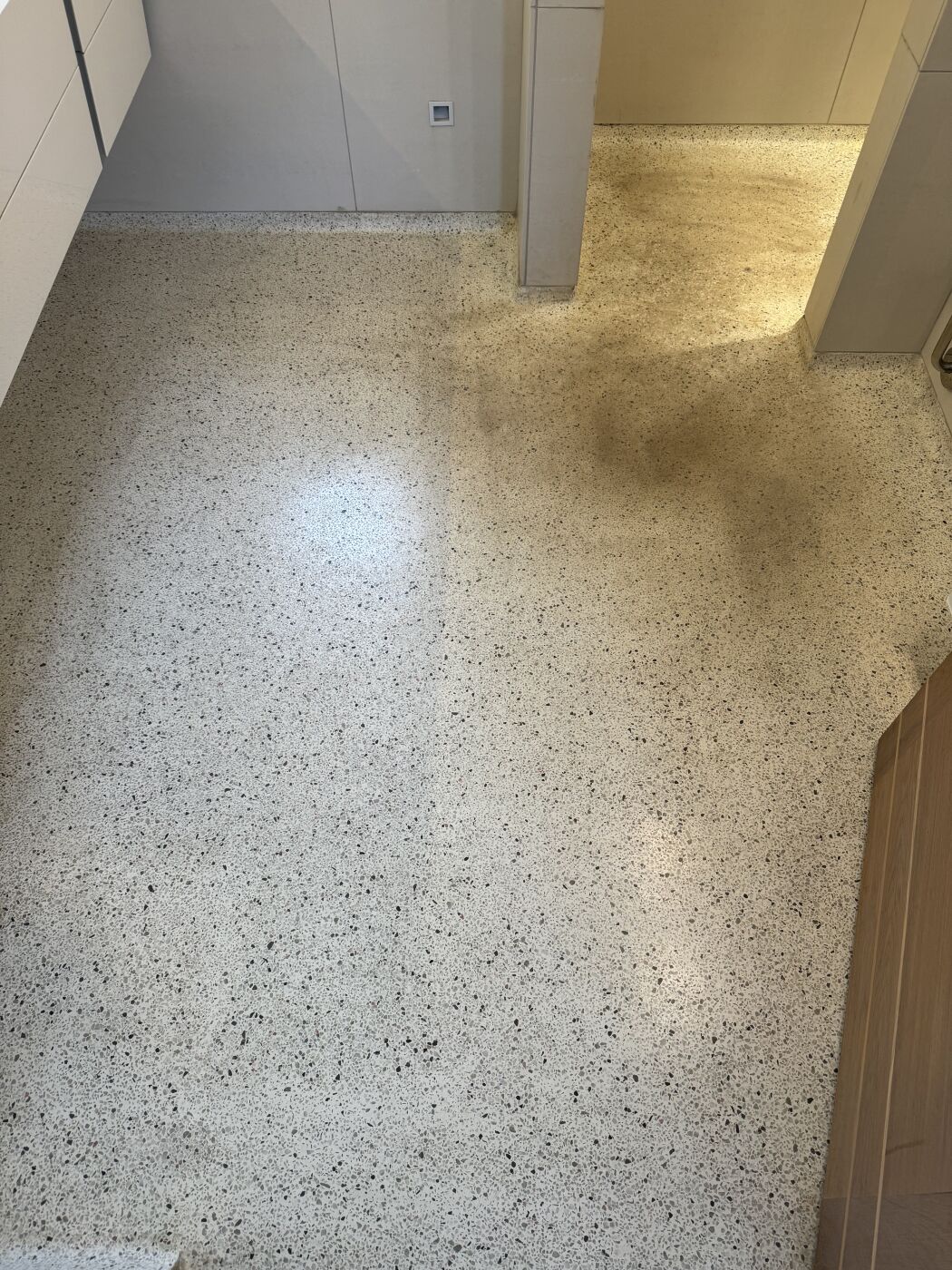 På Sjælland og i København har vi hårdt vand. Det betyder, at mineraler som kalk og jern kan aflejre sig i terrazzoens porer. Ubehandlet giver det hårde pletter og misfarvninger, som almindelig rengøring ikke fjerner. Derfor er korrekt slibning og imprægnering afgørende.